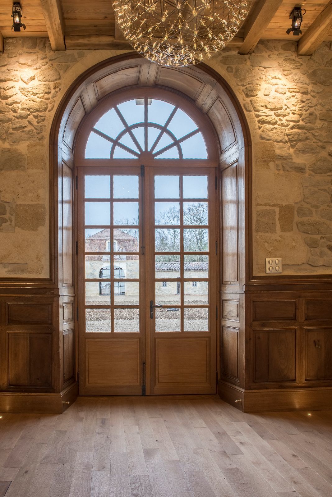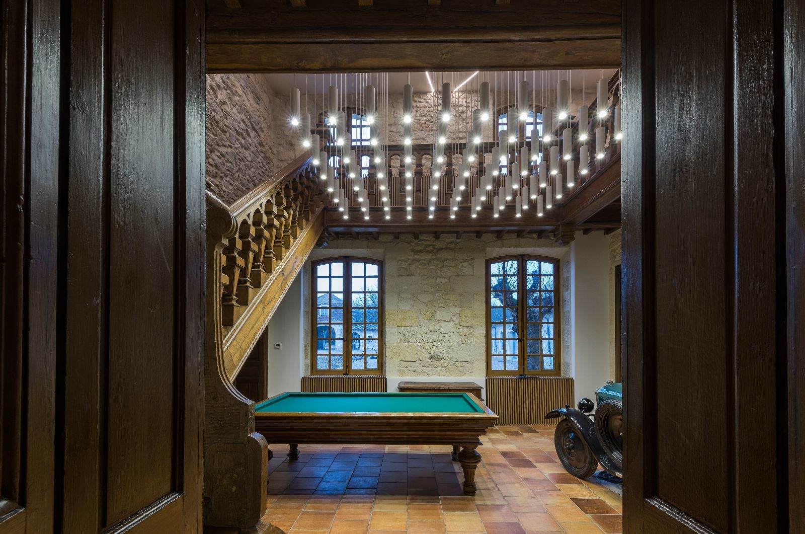 Le premier impact visuel est classique, ancien, mais une seconde lecture plus contemporaine apparait par transparence au travers des vitres, notamment par les éclairages en zigzag visibles en second jour dans le vestibule.